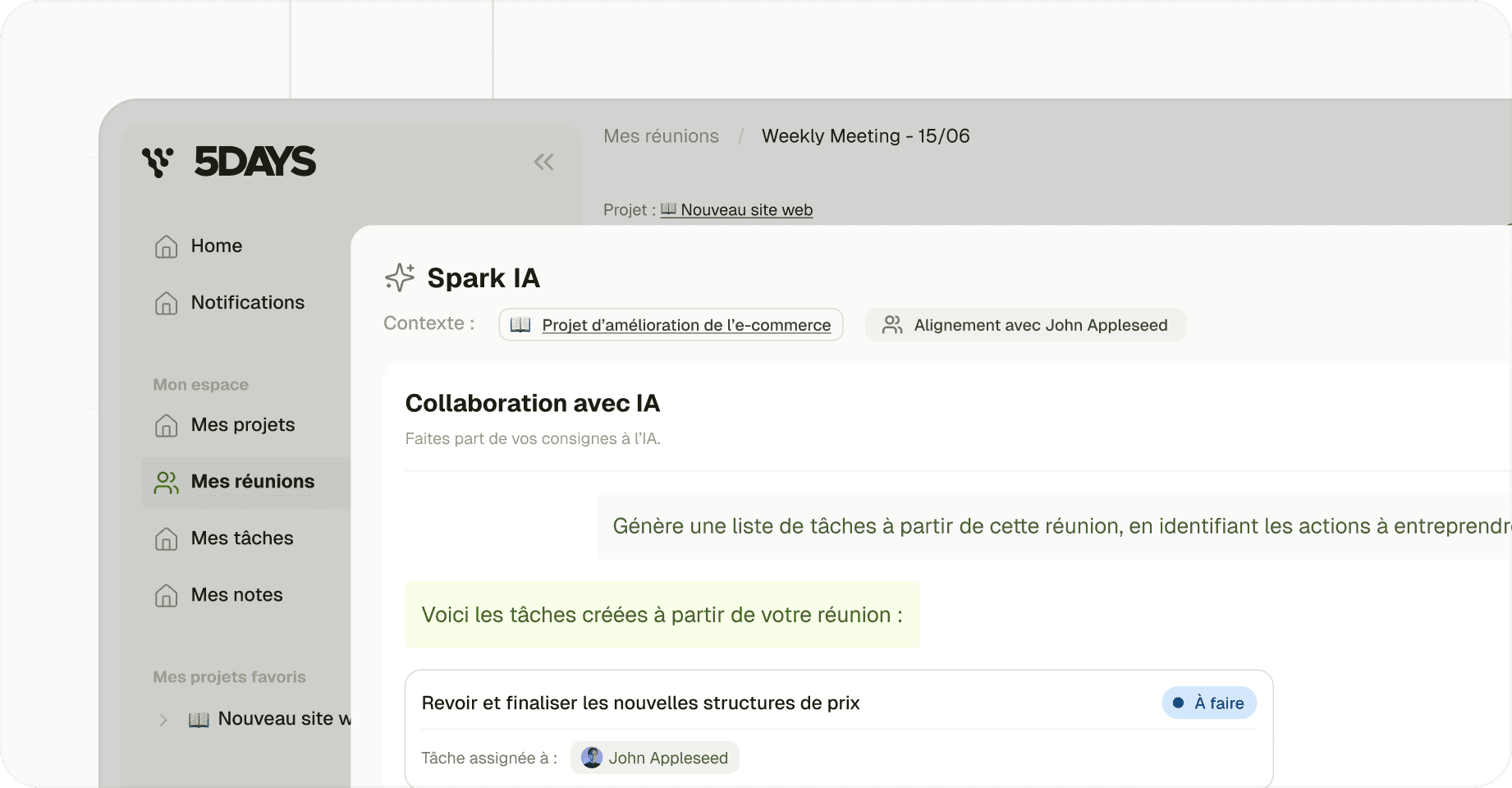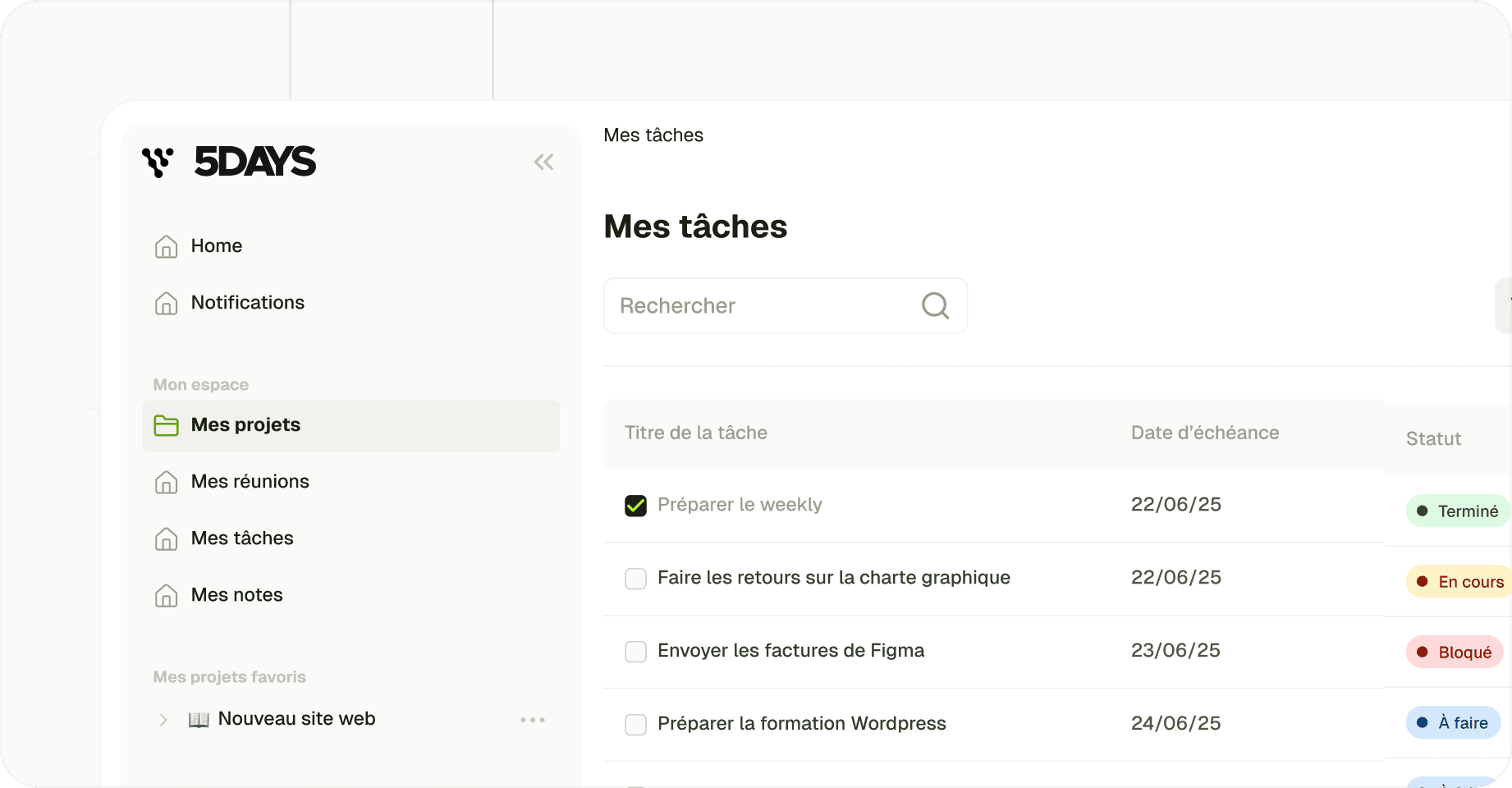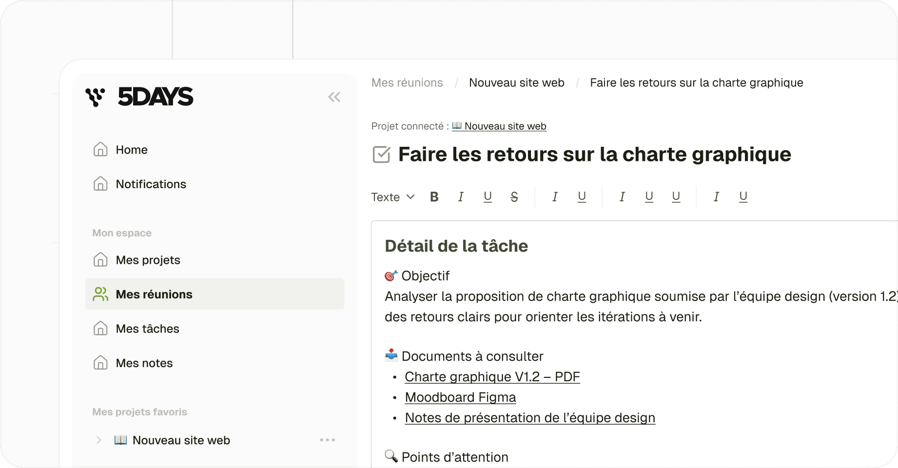 All validated tasks are accessible in 5DAYS, in list view or kanban. Each task is linked to the meeting that generated it, to ensure traceability and accountability.