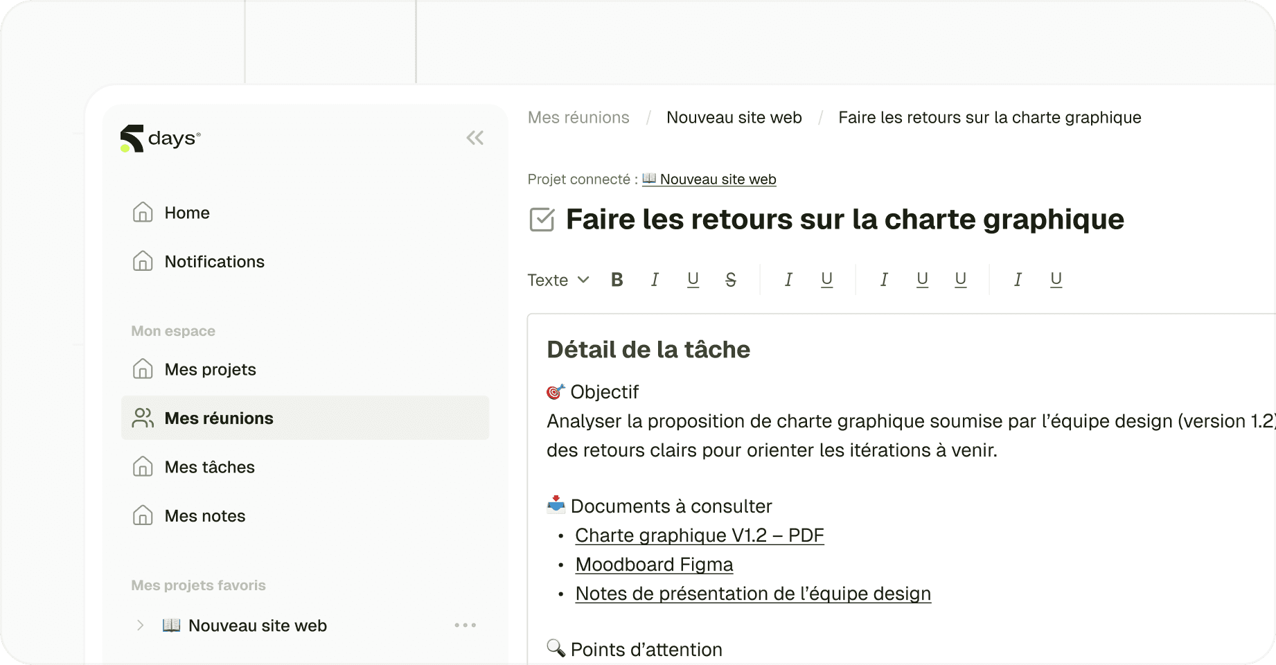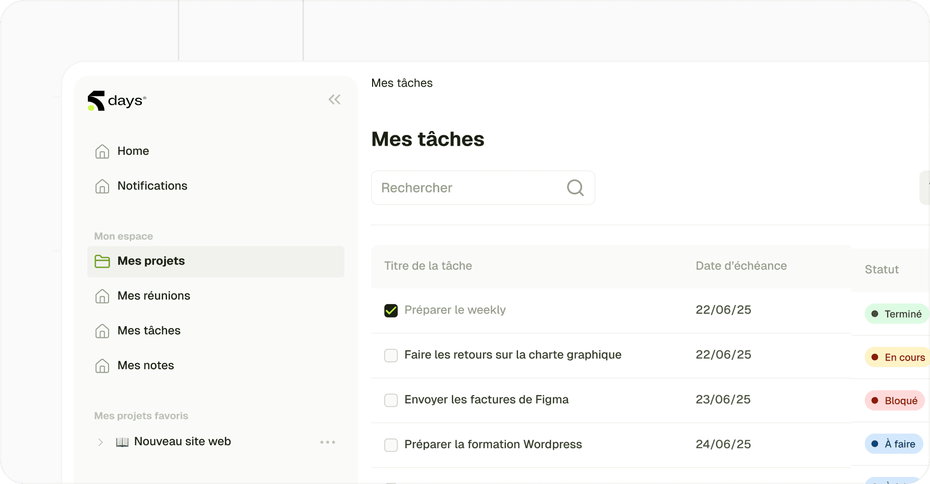 Toutes les tâches validées sont accessibles dans 5DAYS, en vue liste ou kanban. Chaque tâche est reliée à la réunion qui l’a générée, pour garantir traçabilité et responsabilité.